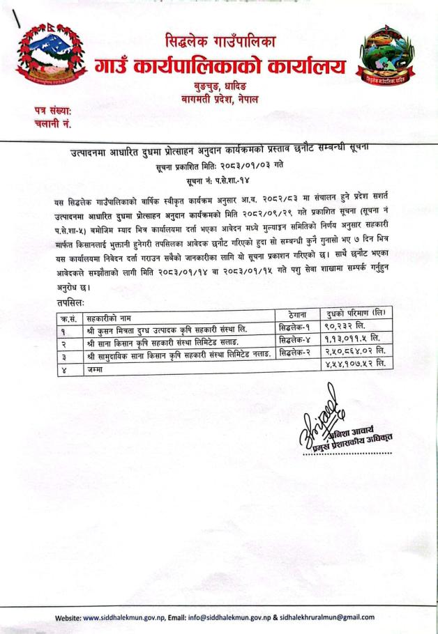 उत्पादनमा आधारित दुधमा प्रोत्साहन अनुदान कार्यक्रमको प्रस्ताव छनोट सम्बन्धी सूचना